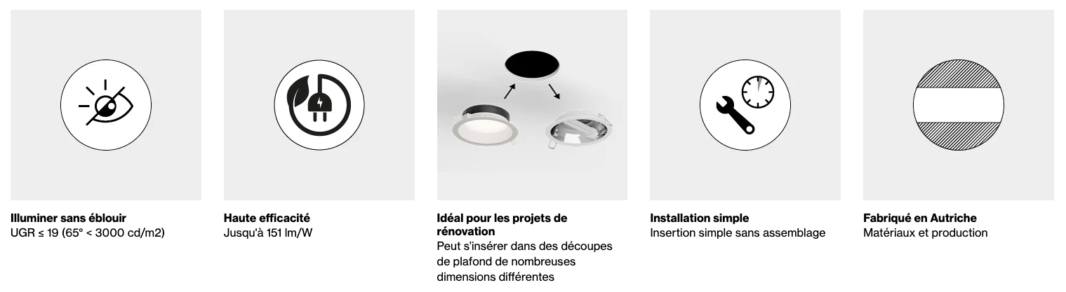ANDRO IQ, le premier luminaire XAL doté d’un boîtier imprimé en 3D, allie l’expertise de IQ LUX en fabrication moderne et la technologie d’éclairage efficace de XAL. Les quatre dimensions disponibles permettent de l’installer dans des découpes d’entre 160 et 240 mm au plafond, ce qui en fait une solution idéale pour les projets de réaménagement, de rénovation et de nouvelle construction. Avec une efficacité pouvant atteindre 151 lm/W, il permet de réduire la consommation d’énergie et, donc, les émissions de CO₂ en phase d’utilisation. Fabriqué en Autriche, ANDRO IQ arbore une finition de haute qualité et une simplicité d’installation à couper le souffle. Disponible avec un diffuseur à lentille ou microprismatique (UGR ≤ 19), ainsi qu’avec un diffuseur opale.